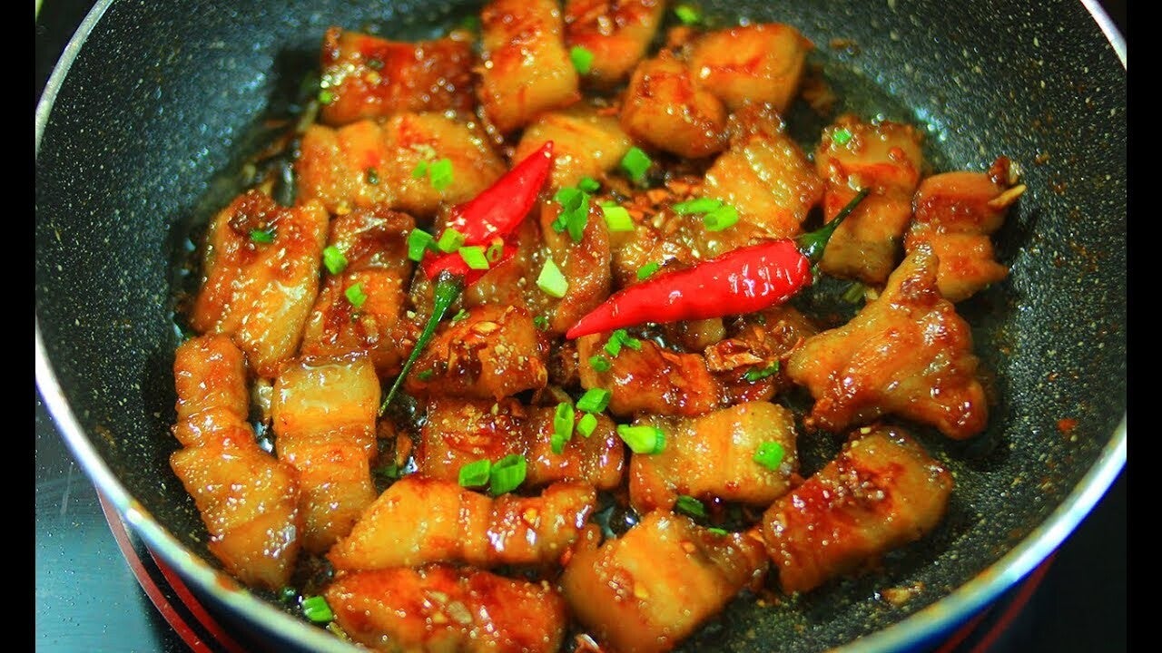 Caramelized pork belly is a rich and flavorful dish featuring tender pork belly slow-cooked in a savory-sweet glaze made with fish sauce, soy sauce, and sugar. It can be spicy or non-spicy, depending on preference.